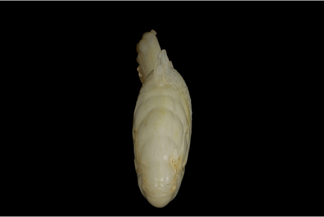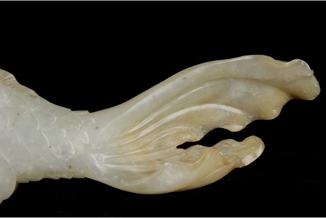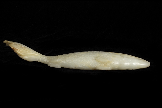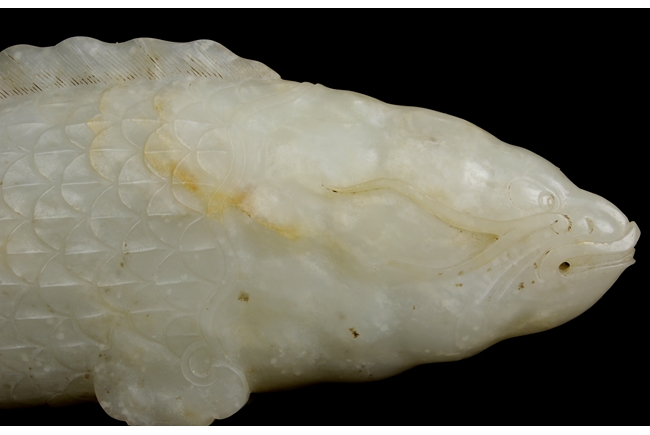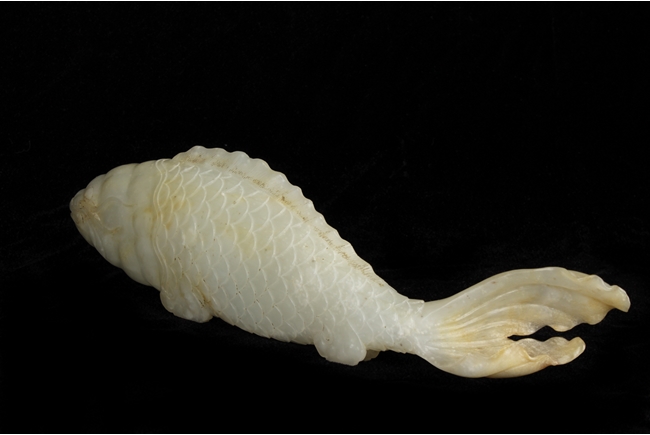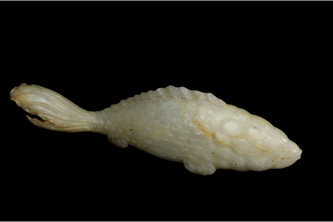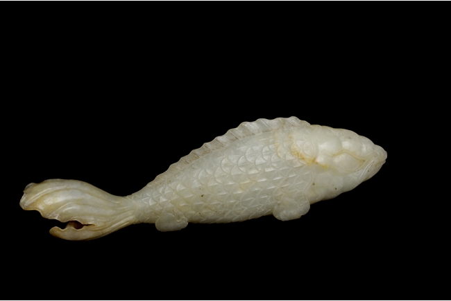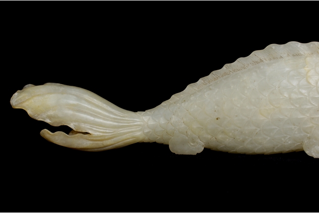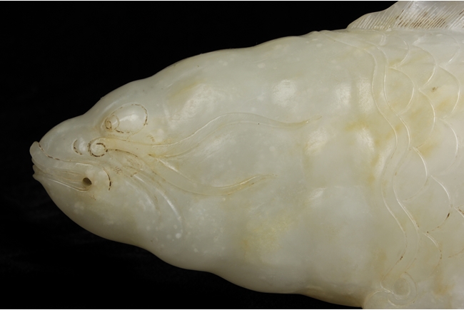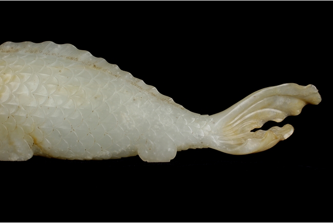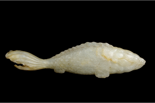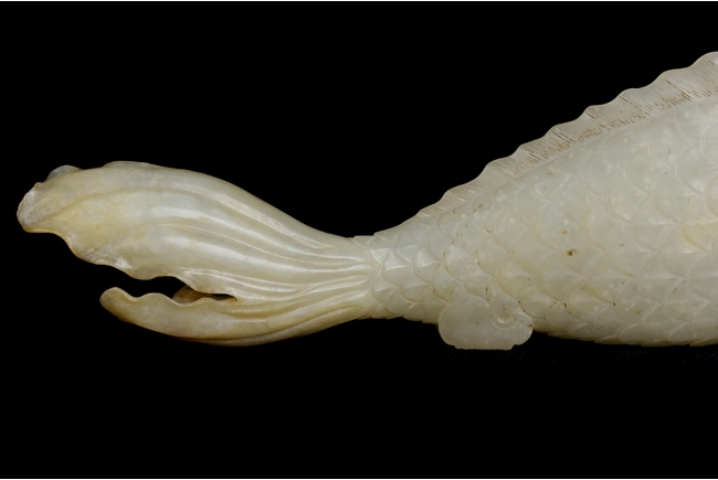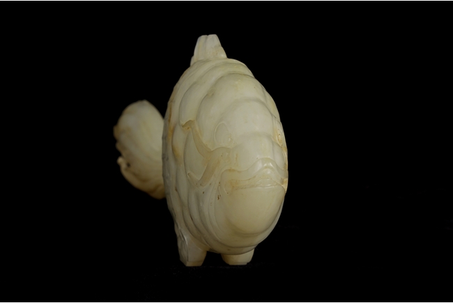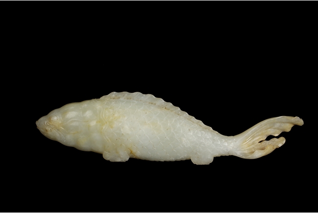 The stone of semi-translucent even color and occasional russet, the well carved figure depicts a carp swimming, with detailed fin, scales, barbels, and tail. Qing Dynasty period.