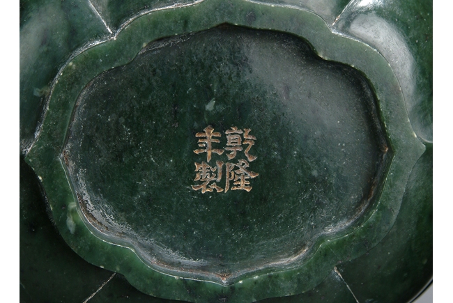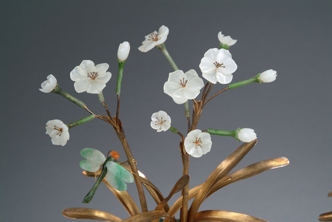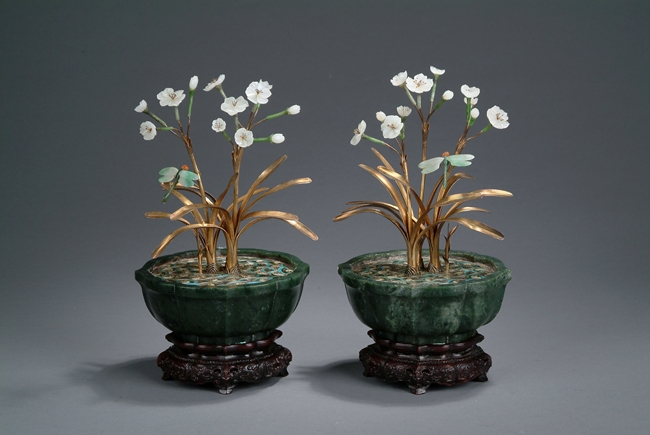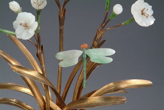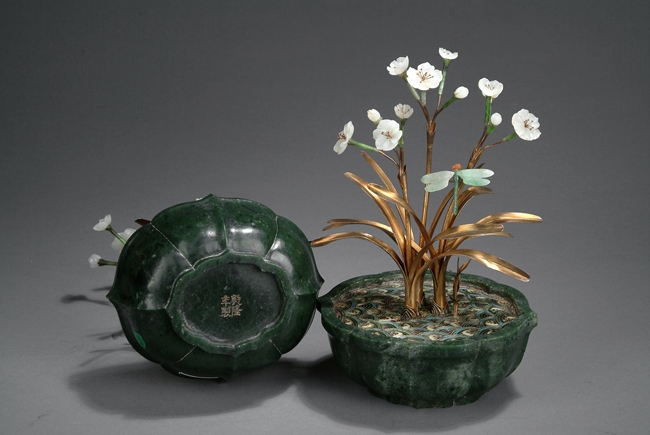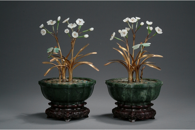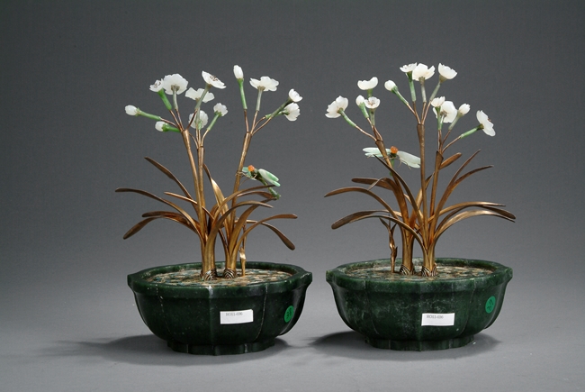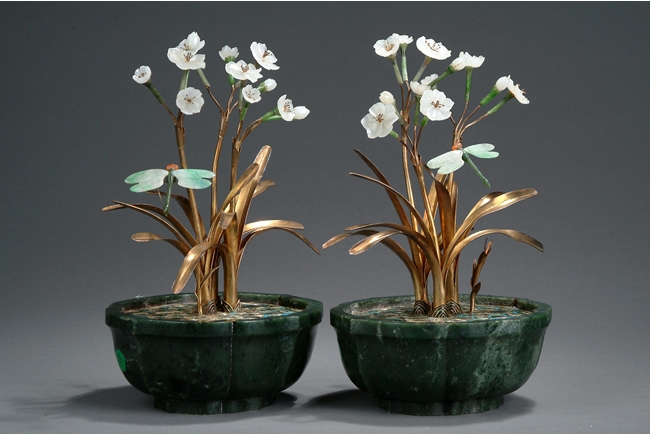 "The pair of beautiful and masterfully created orchid planters were made from white jade, jadeite, jasper, and gilt bronze. Some orchids are fully bloom, while some are still in bulb form. Each planter has an intricately carved jade dragonfly landed on the gilt bronze leaves. The composition symbolizes vast fortune. Bottom bears four characters "QIANLONG" mark. Completed with original carved wooden stands. Qing Qianlong Dynasty period.
