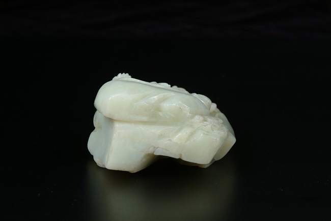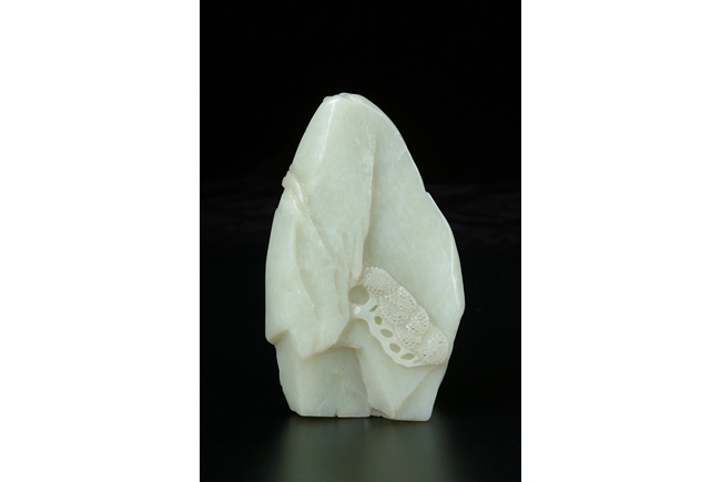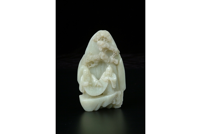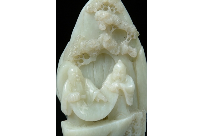 Carved in relief to one side with two scholars holding a long scroll on a rocky ledge beneath a pine tree, the reverse with a single pine tree branch. 19th century.