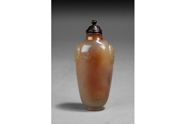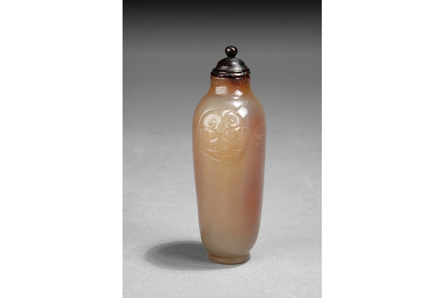Of tapering, elongated cylindrical form, the narrow sides are carved with beast mask form heads, the agate of milky light grey color with a hint of honey brown in the middle, capped with a wood lid. Missing spoon. Qing Dynasty period.