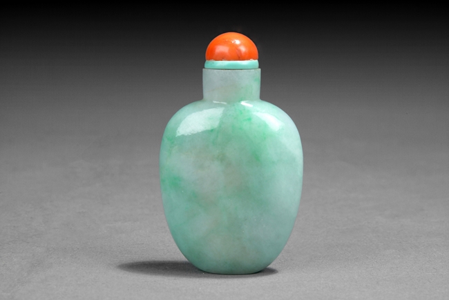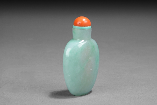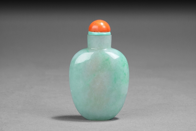 The well-hollowed bottle is of flattened, ovoid form. The softly polished stone is suffused with pale, emerald-green cloud-like mottling, capped with a coral stopper. Qing Dynasty period.