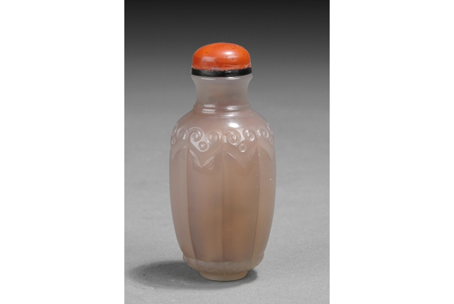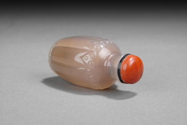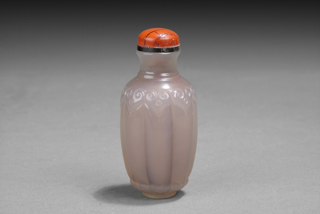 Of elongated cylindrical form, the grayish lavender colored agate with vertical fluting below the cylindrical neck, a band of petal like carvings encircles the base, and capped with a hard stone stopper. Missing spoon. Qing Dynasty period.