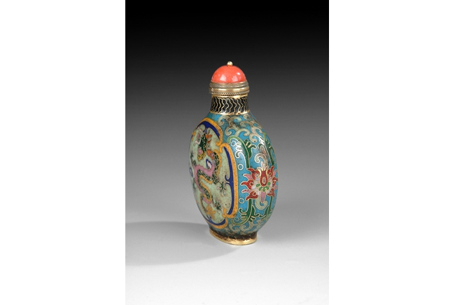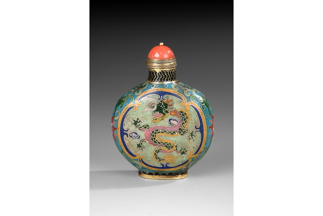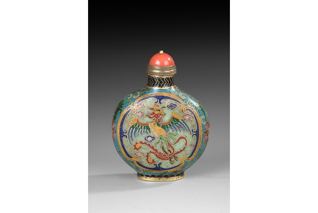 Circular body rising to a short, cylindrical neck, topped off with a hard stone stopper. One side enameled with a phoenix while the other side with a five claw dragon. Vine patterns and decorations on the side. 19th century.