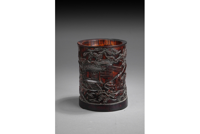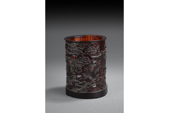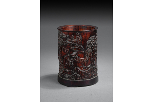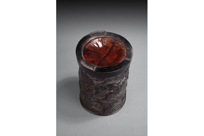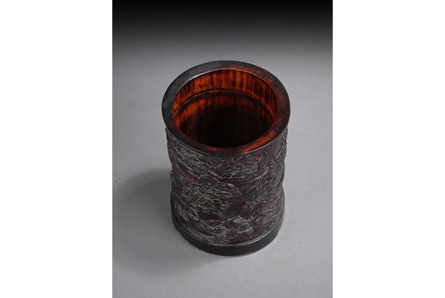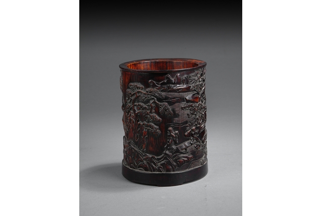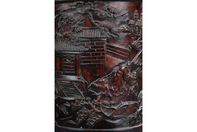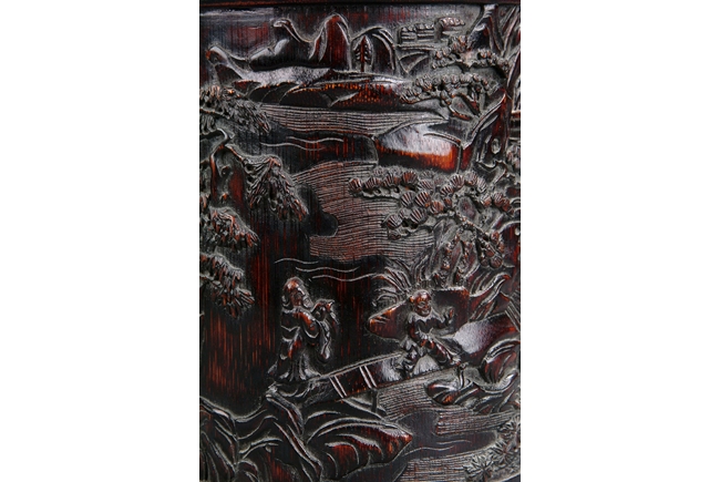 Of tapering cylindrical form, the body carved in relief with continuous mountain and river scene, with people, pavilions, river, bridge, and pine trees. 19th century.