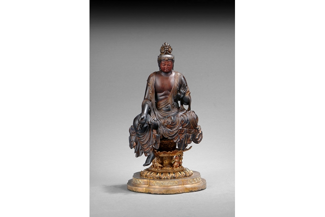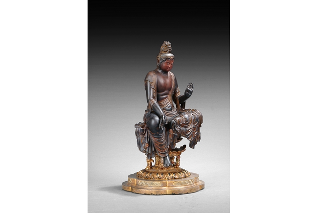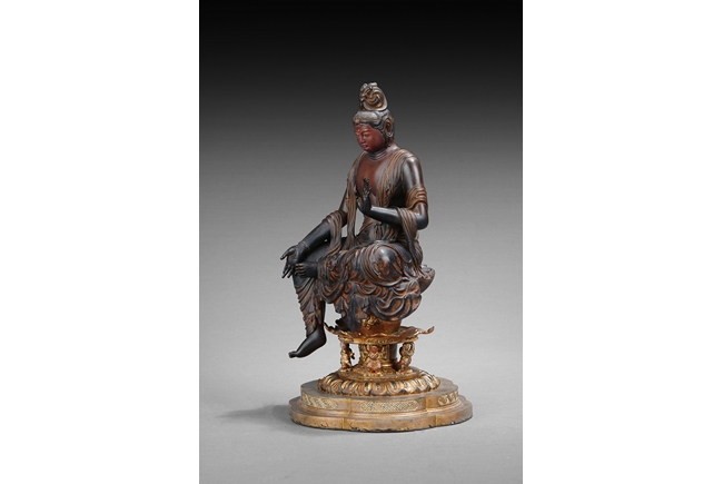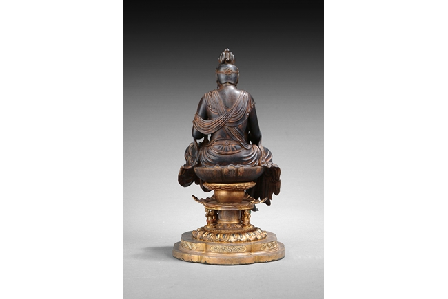 A wooden figure of Shakyamuni seated in Lalitasana atop of a lotus shaped tall seat, supported by four small figures. The Buddha is dressed in robe open at the chest, left hand presenting Abhaya Mudra and right hand presenting Varada Mudra.