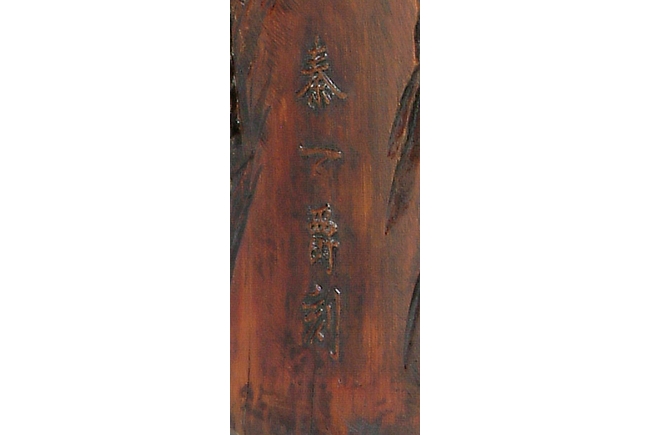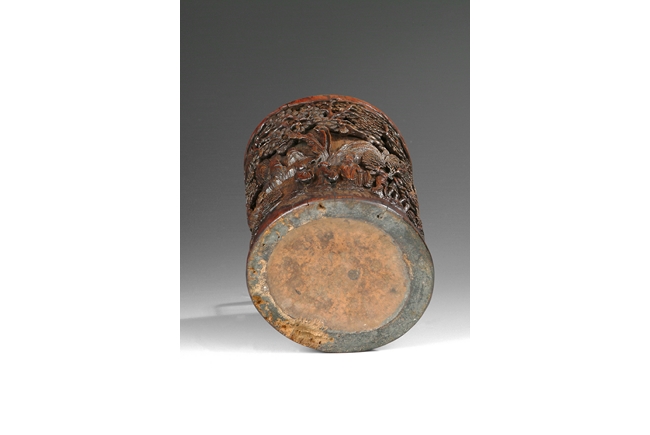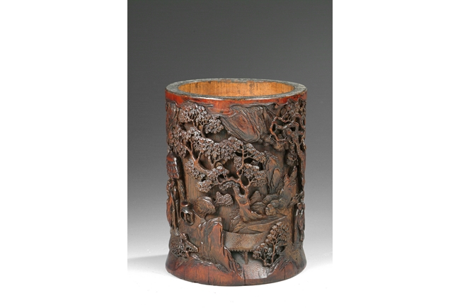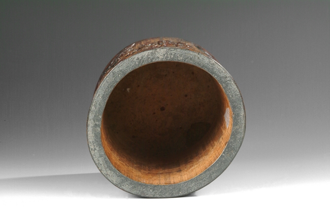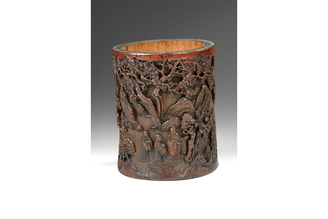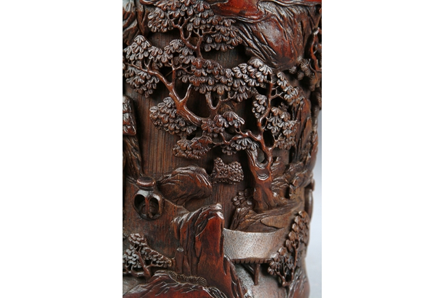 The brush pot is deeply carved around the cylindrical exterior to depict a continuous scene of the mountain pass, with people conversing, working, and gathering around pine trees, mountains, rocks, and bridges. Four characters mark "QINYIJUE" on the side. Qing Dynasty period.