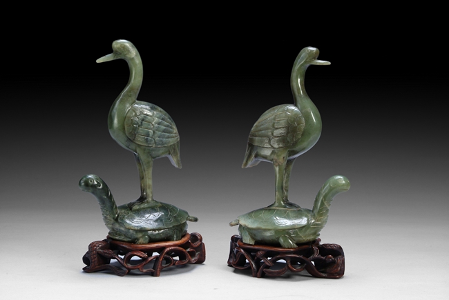 Each figure depicted a crane and turtle, looking towards the same direction. The design signifies longevity, and the pair came with matching wood stands designed with lotus flower patterns. 18th/19th century.