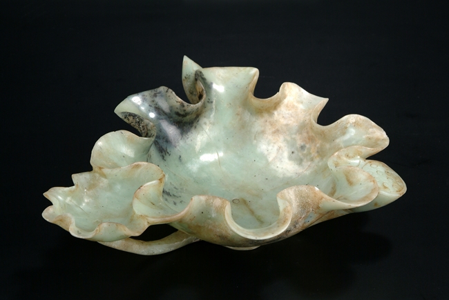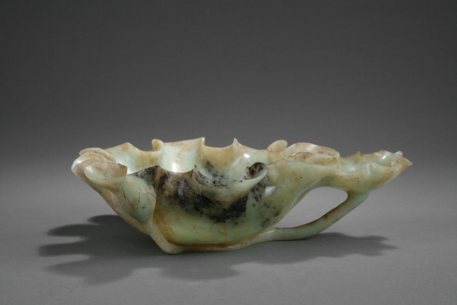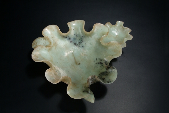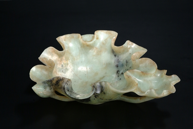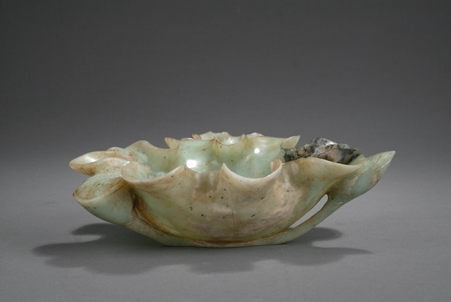 Of folded lotus leaf shape, the well carved stone has two lotus leaf receptacles, with base supporting the leaf with carved pod and stems. The stone is of pale grey-green color with dark green speckling and some opaque white mottling. Qing Dynasty period.