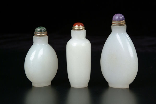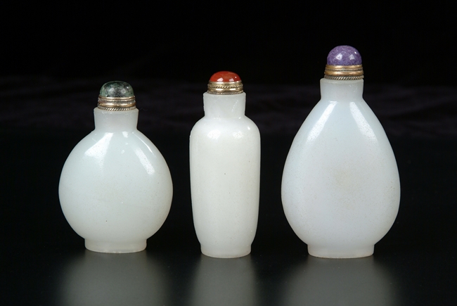 The group comprises three white glass snuff bottles of different shape, one in flattened ovoid form, one in high-shouldered cylindrical form, and the other one in pear shape, and all raised on a short oval foot rim. Each snuff bottle is capped off with a color hard-stone stopper. Republic period.