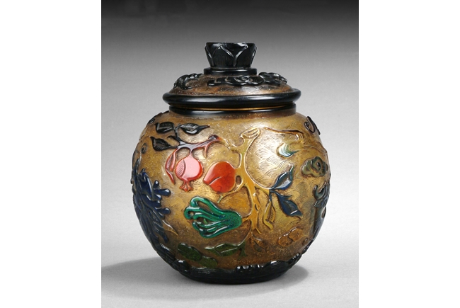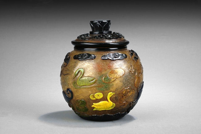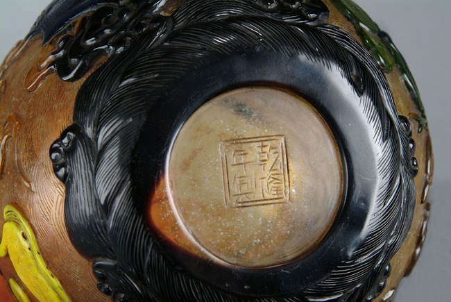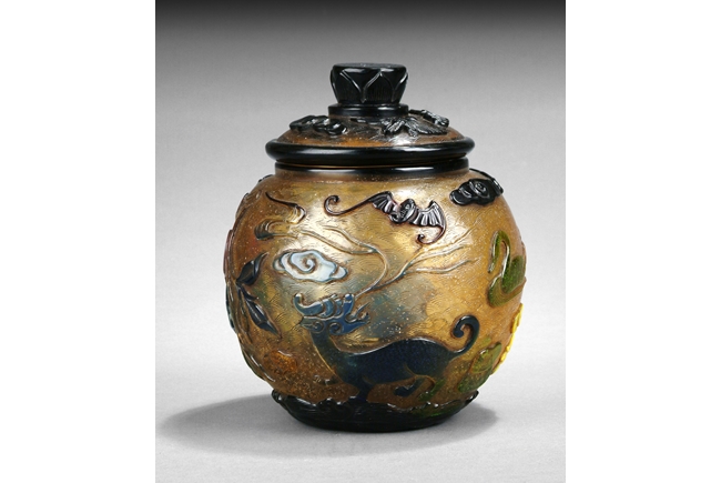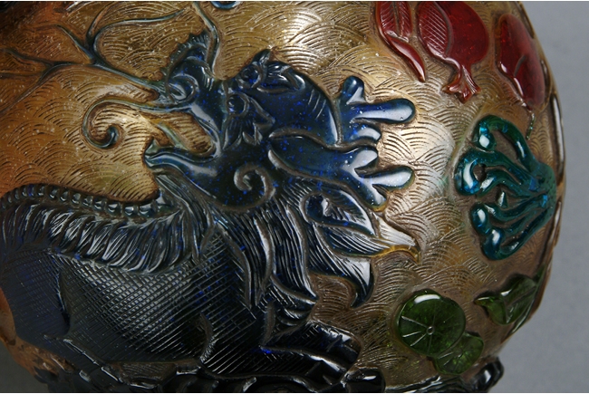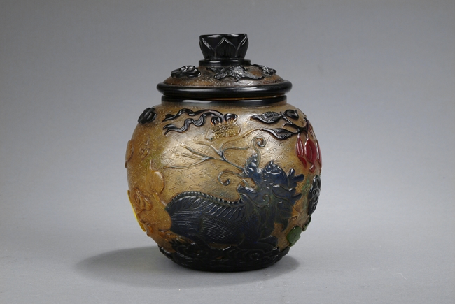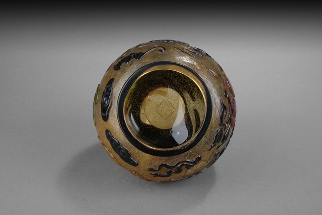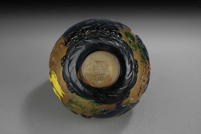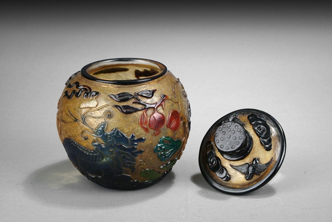 Of globular form, the overlay depicts colorful mythical creatures, bats, peaches, Buddha's hand, clouds, swans, and lotus petals, with ocean wave as base. The lid depicts cloud and birds, with lotus pod as finial. Four characters "QIANLONG" mark on the bottom.