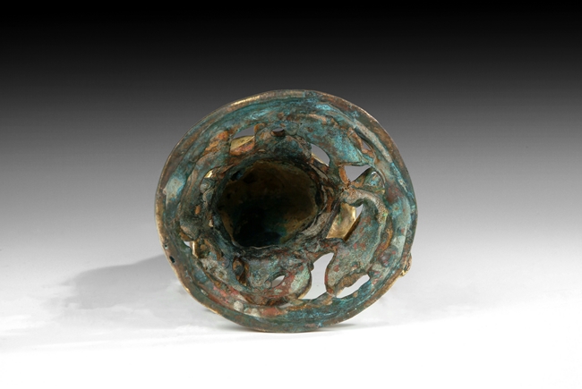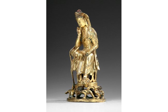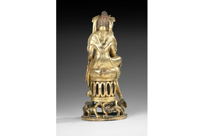 Finely casted, the Bodhisattva seated in Lalitasana on a high throne supported by multiple beasts, left hand on his knee, right hand close to chin, with serene expression. 18th Century.