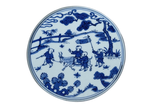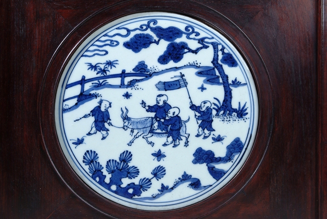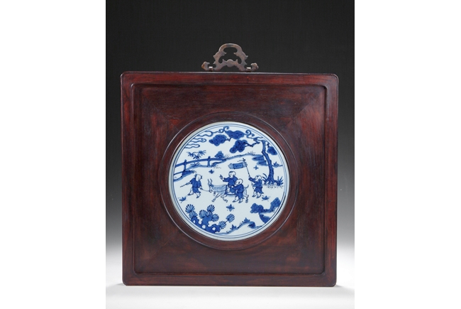 This hanging plaque consists of a circular blue and white panel painted with children playing in the garden setting. The panel was mounted in an outer Zitan frame. Ming Dynasty period.
