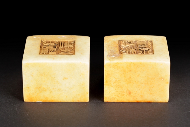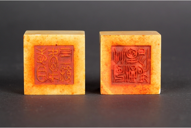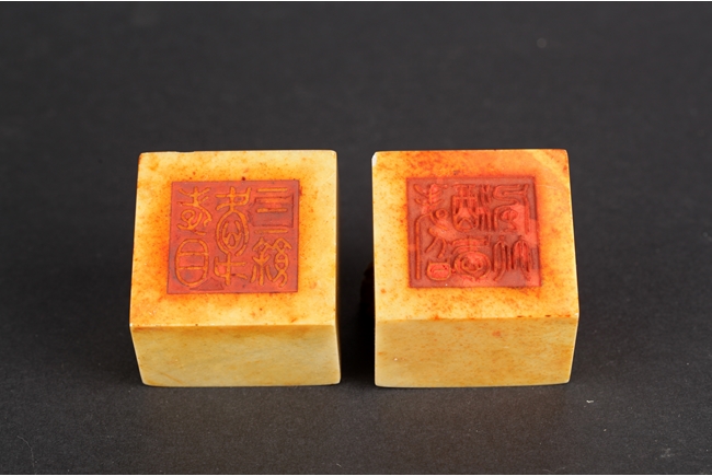 Of rectangular shape, the two seals with different four character marks on top and bottom, with slight russet over mostly yellow stone.