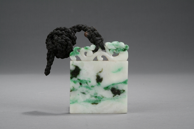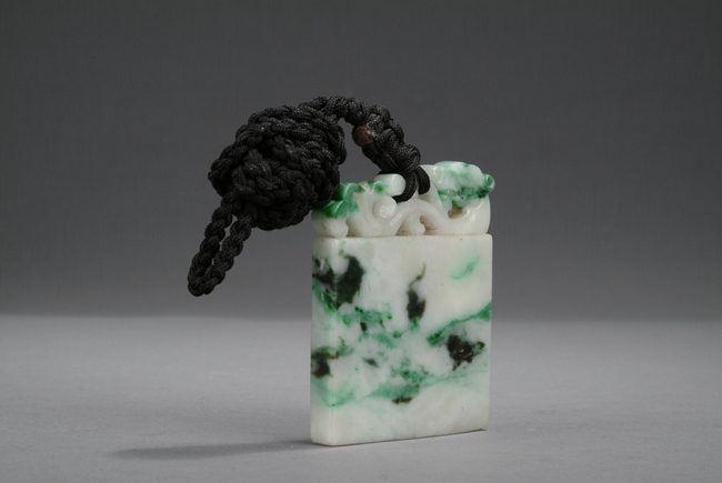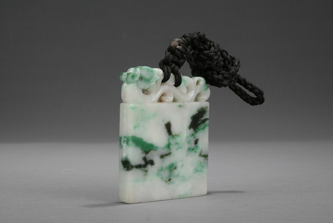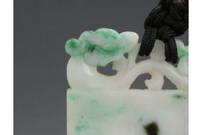 The well carved Chilong stands on top of the pendant, head turned back; russet of spinach green and light green scattered prominently over the whole pendant. Republic period.
