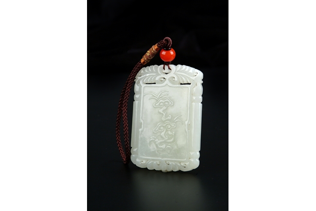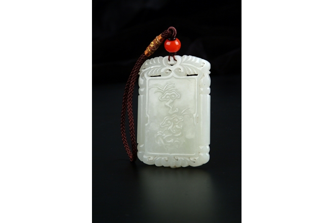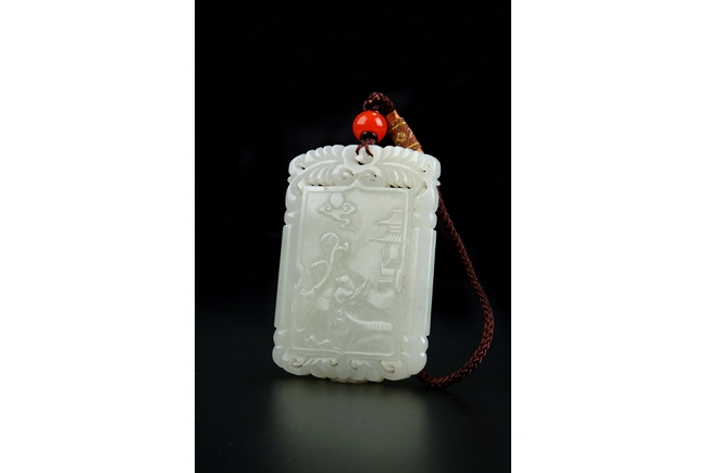 Of rectangular form, carved in low relief on one side with an elder smiling beneath a full moon and clouds above, the reverse carved with delicate cloud like patterns, all set within a border surrounded by two openwork vine patterns on top and bottom, the stone of even white tone. Qing Dynasty period.