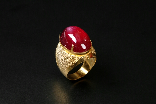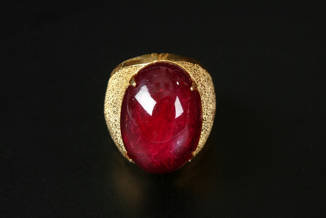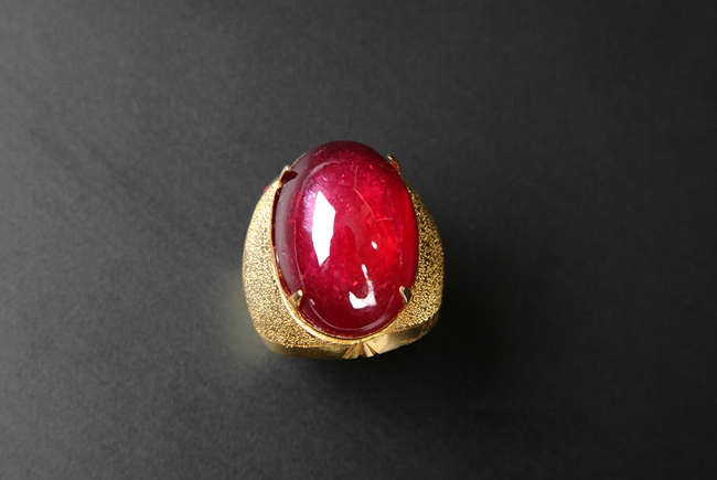 The oval shaped Myanmar ruby was set into a yellow gold setting, with minimal patterns. The gem of alluring red color.