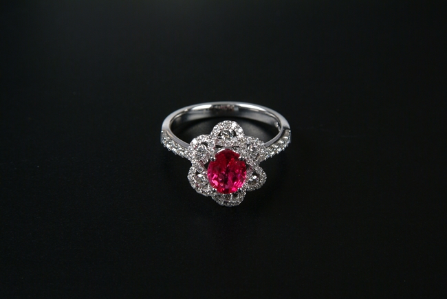 18k white gold ladies ring, containing one natural Burma Ruby, 1.09 carats, 6.82x5.65x3.50mm, oval-shape, mixed-cut, in dark red vivid and even color, very good cut and polish. Also includes 72 round, brilliant-cut diamonds total 0.58 carats, average quality is VS2 clarity grade, G color grade, very good cut and polish. Includes Geological Laboratory Services certificate.