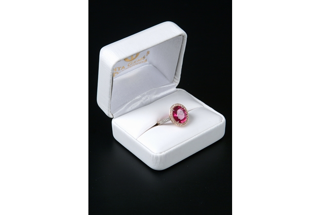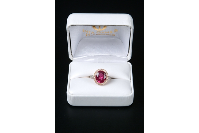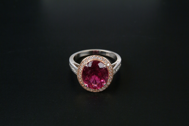 18k white and rose gold ladies ring, containing one natural rubellite (pink tourmaline), weight 5.42 carats, measurements 11.50x9.75x5.42mm, oval-shape, mixed cut, in dark pink-red vivid even color, very good cut and polish. Also contains 46 round, brilliant-cut diamonds total 0.40 carats in weight, average quality is VS2-SI1 clarity grade, H color grade, and very good cut and polish. Includes Geological Laboratory Services certificate.