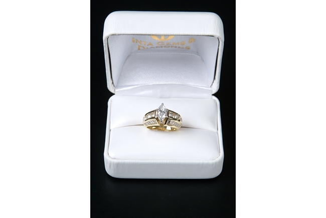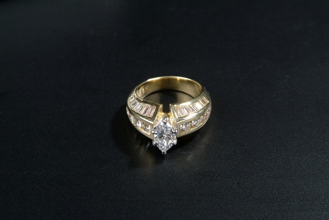 18k yellow gold ladies ring, containing one diamond, marquise shape, brilliant-cut, weight 0.75 carat, measurements 9.20x4.85x2.82mm, clarity grade SI1, color grade G, very good cut and polish. Also contains 28 baguette-cut diamonds total 1.02 carats, and 8 round, brilliant-cut diamonds total 0.51 carats. Average quality is VS2 clarity grade, H color grade, and very good cut and polish. Includes Geological Laboratory Services certificate.