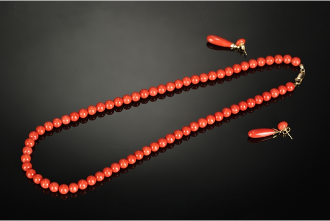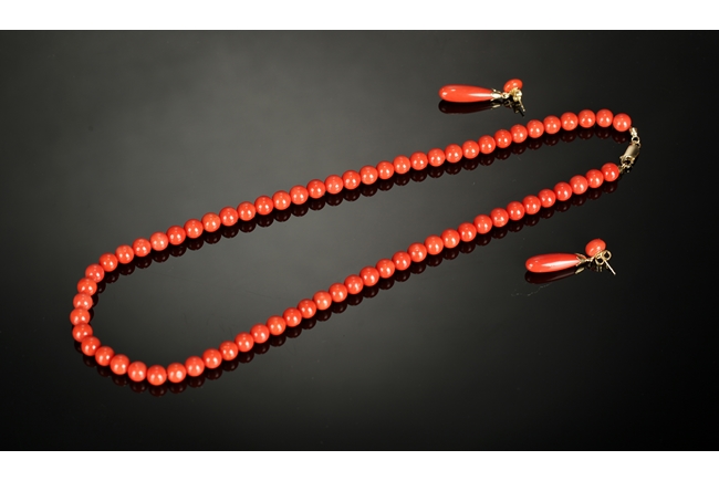 Of orange-red color, the necklace contains similarly sized coral beads measured at 7mm, with 18k yellow gold clasp. The earrings come with teardrop shaped coral and coral bead of similar color.