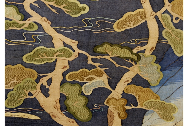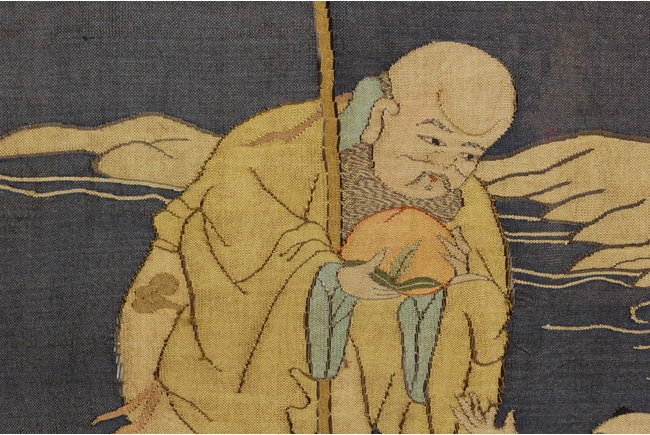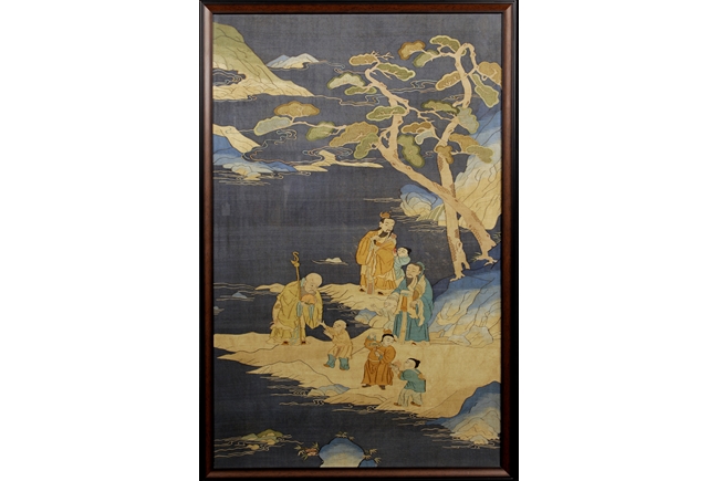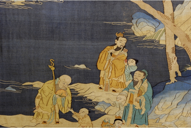 Finely woven and painted with an elaborate scene of elders with kids at a river shore setting, rocky promontories, turbulent waves, with peaked mountains emerging from vaporous clouds in the distance, all picked out in shades of blue, green, beige, cream and brown, against a dark blue ground. The Shou Lao holding a large peach, with three kids forming a line in front, the other two elders each with a young kid by their side. Qing Dynasty period.