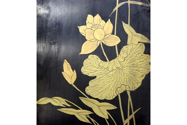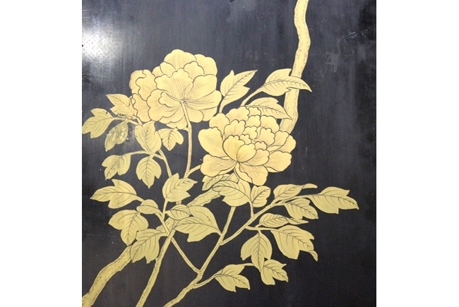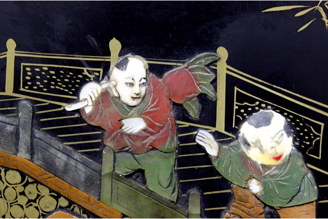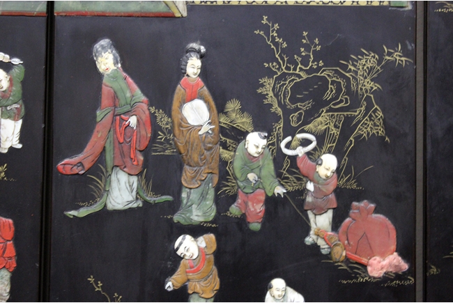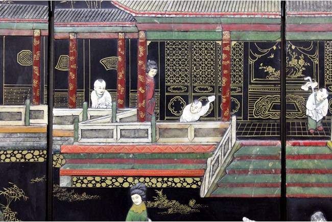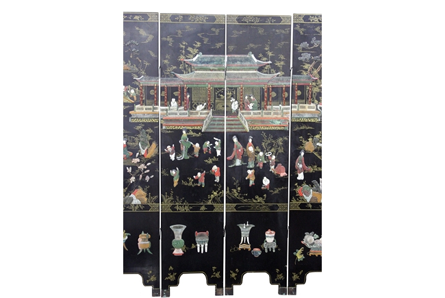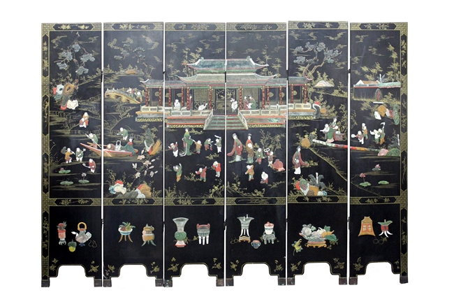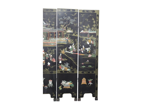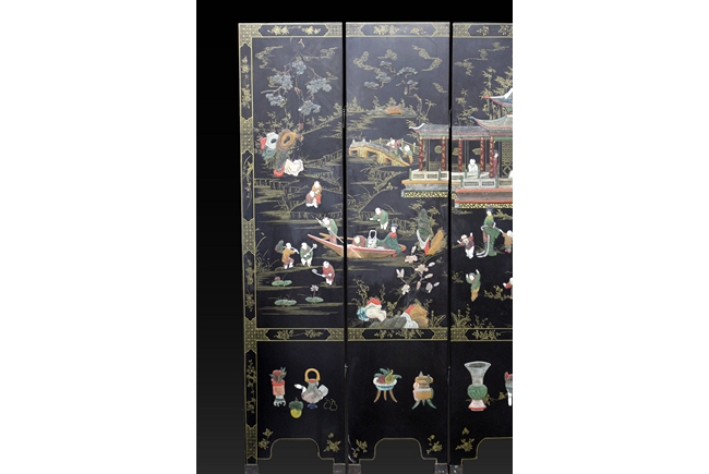 The floor screen is made up from six separate rectangular applique lacquer panels, together forming a palace scene with many families and children gathered in front. The panels are decorated with Shoushan soapstone, jade, ivory, mother of pearl, chicken blood stone, and Qingtian stone, forming palace, people, rocks, and treasures. On the back the panels are gilt decorated with six different type of flowers.