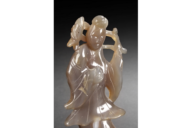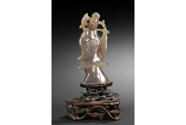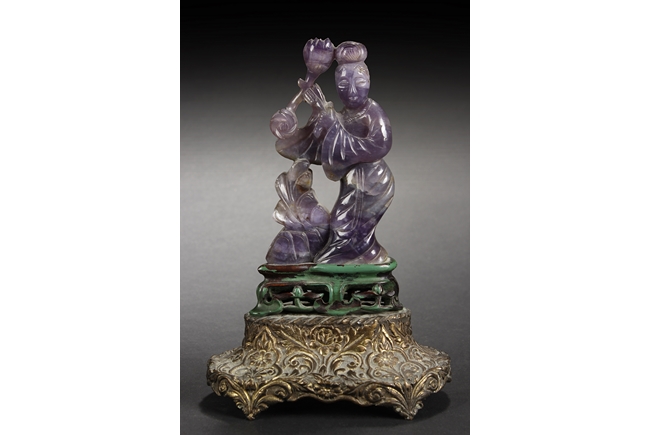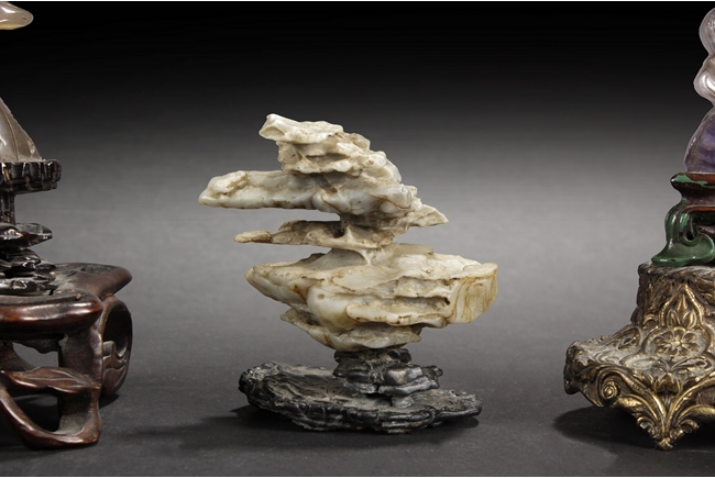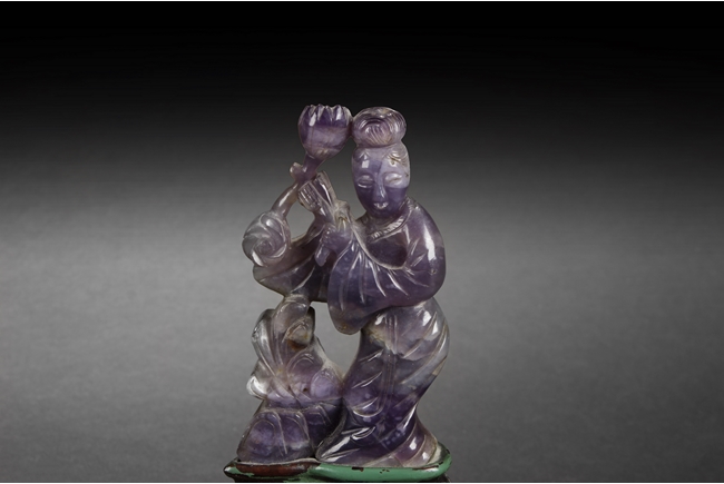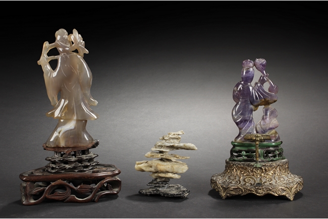 The carved amber lady is holding a large Lingzhi, looking to one side, and standing on a pad of Lingzhi. The carved rock crystal lady is holding a lotus flower, while standing on a lotus pad, with a large leaf beside her. The small scholar viewing stone of yellow-white color, with layered design. All with original stands.