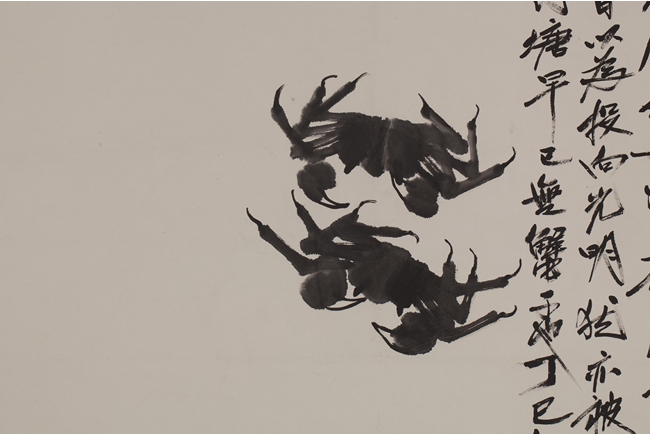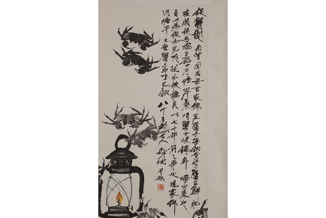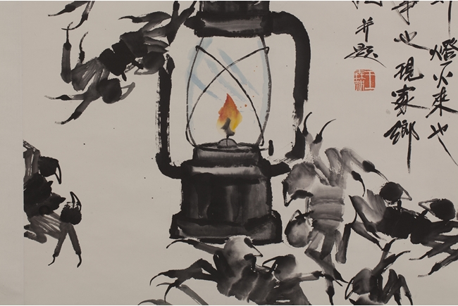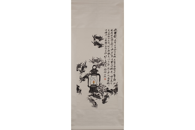 This painting depicts many crabs crawling next a black oil lamp, indicating the method of catching crabs. Artist signature and seal mark on the side.