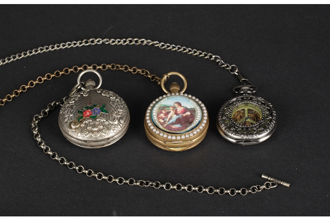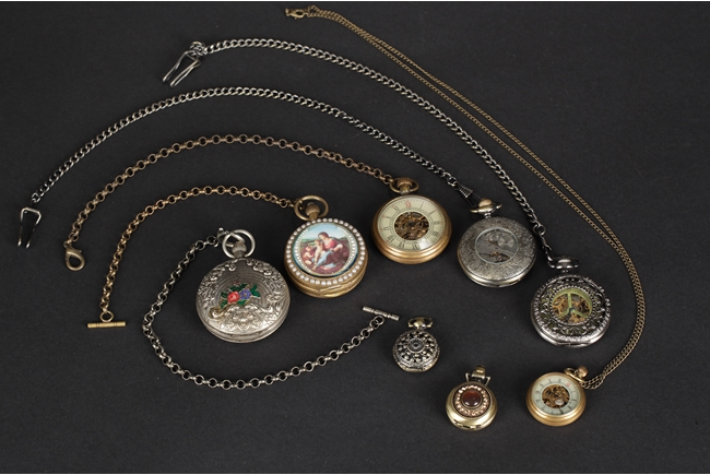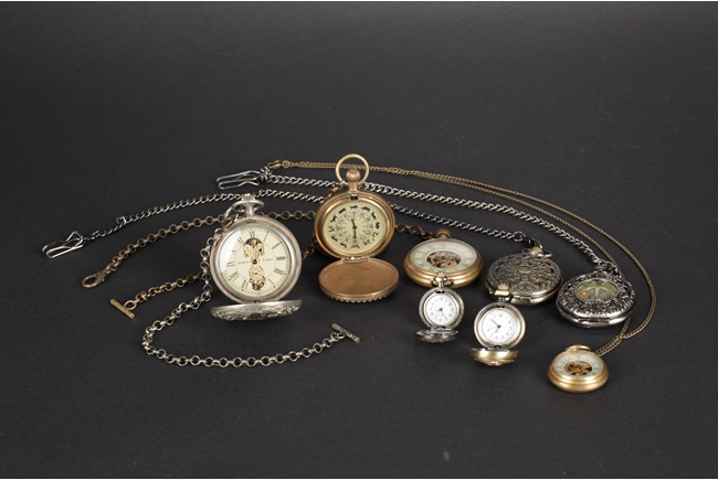 The group includes eight different sized and themed round pocket watches, six include metal links.