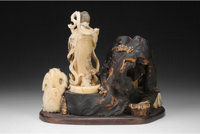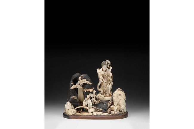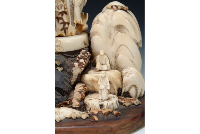 This figural group consist of a large Guanyin, arising behind a landscaping carving. Human figures, waterfall, pine trees, and wooden bridges. The mountain range was carved out of wood, inset with ivory carved pine trees, boulders, and human figures. Early 19th century.