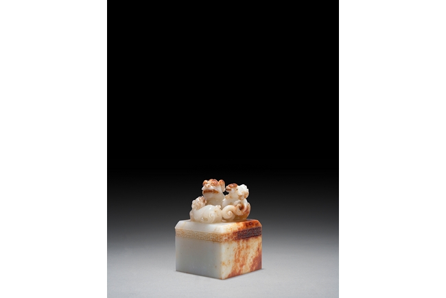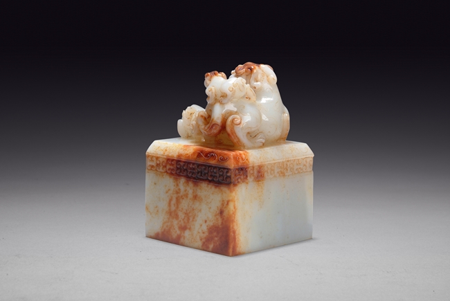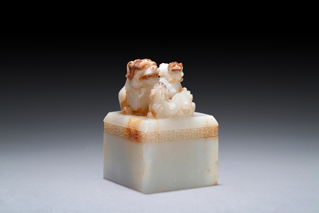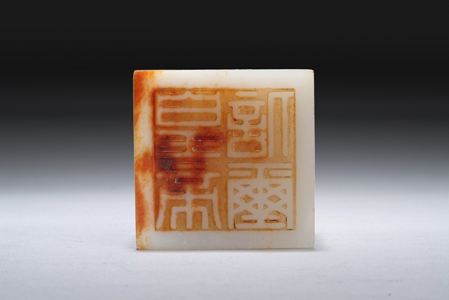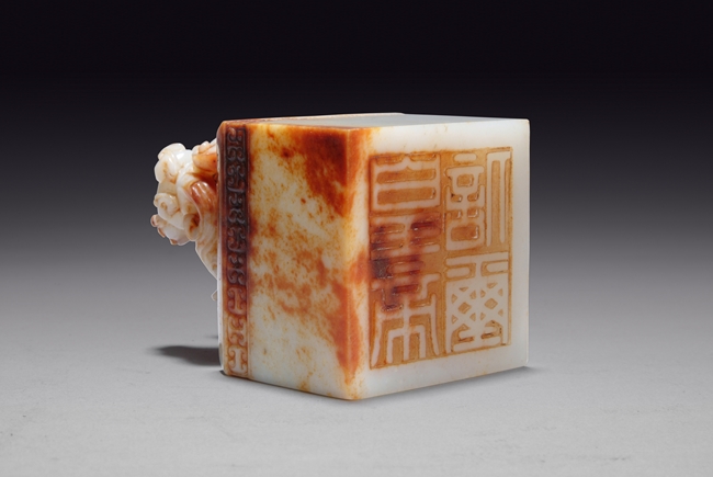 This squared shaped jade Imperial seal with knob carved as three lions and a continuous band of Ruyi pattern on the side. The base is carved with four Chinese character, signifying for the use of Imperial family.
