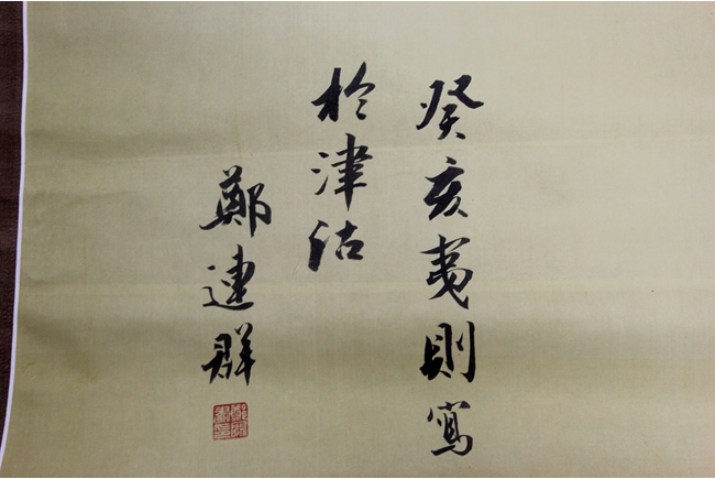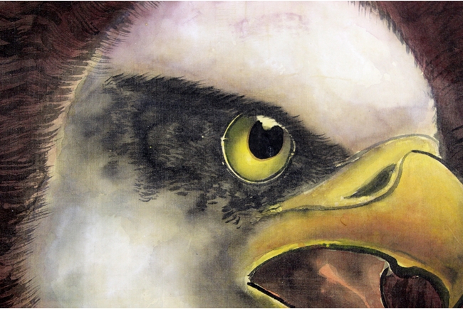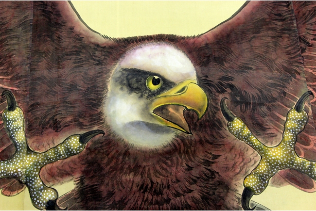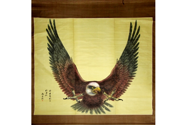 The large painting depicts a flying eagle, spreading wings and claws, swooping down towards the prey. Artist signature and mark "Zheng Lianqun" on the left side. Exceptionally large, very rare for modern Chinese artist.