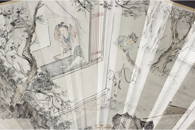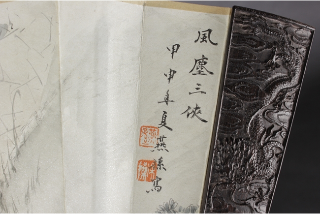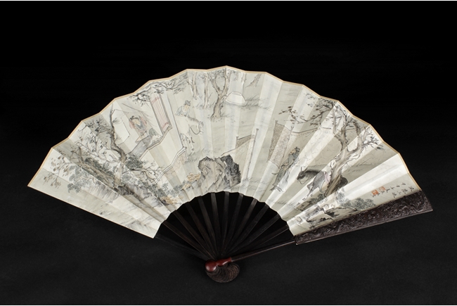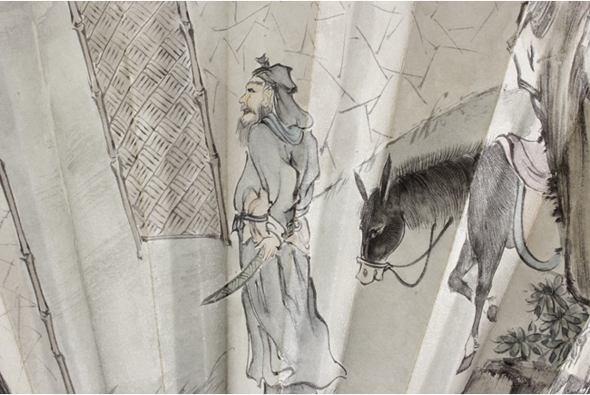 Fan leaf painted with the story of "Feng Chen San Xia", depicting the first meeting between Li Jing, Hong Fu Nv, and Qiu Ran Ke. Artist mark and seal on right.