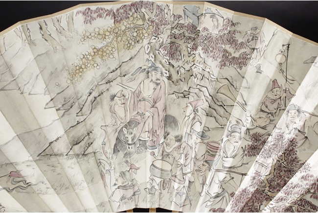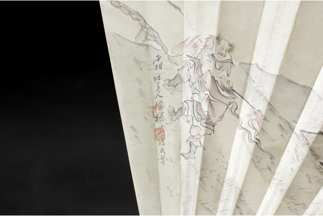 Fan leaf painted with twelve 'Yaoguai' demons, surrounding a bearded man on a donkey, all within a mountain ranger with river. Artist mark and seal on left side.