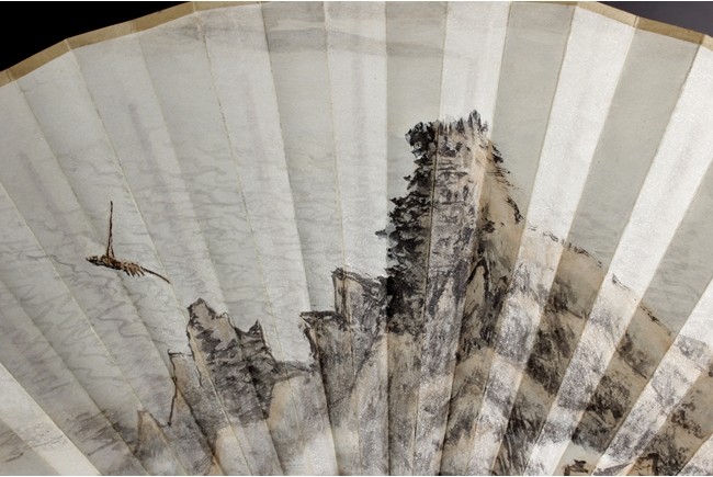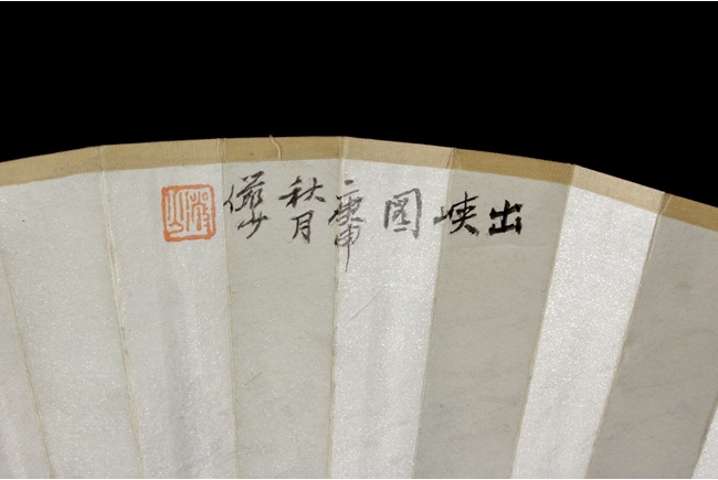 Fan leaf painted with a small boat sailing out of the river gorge, with artist seal mark on top and right side.