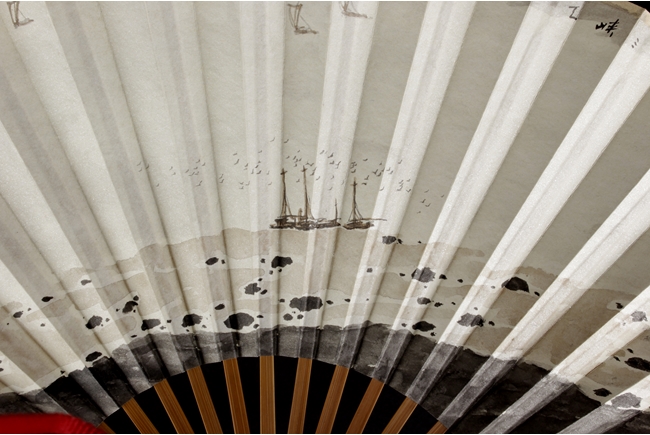 Fan leaf painted with sail boats and ships traveling on water, surrounded by many seagulls. Calligraphy and artist mark on top.