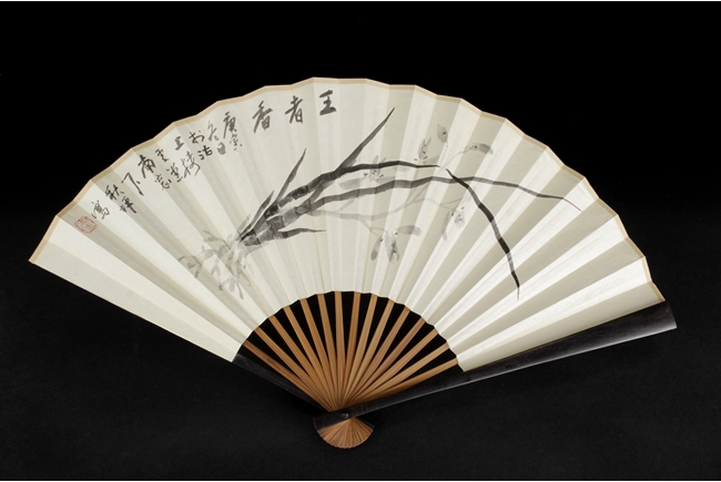 Fan leaf painted with a branch of blooming orchid flowers. Calligraphy and artist mark on top.