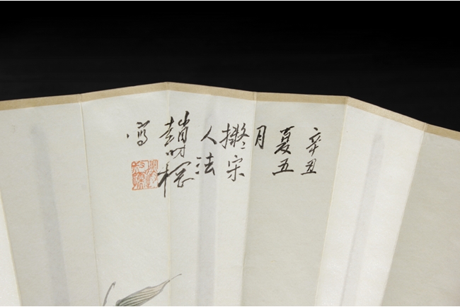 Fan leaf painted with a bird perched on top of bamboo stick with sprouting leaves. Artist seal and mark on top right.