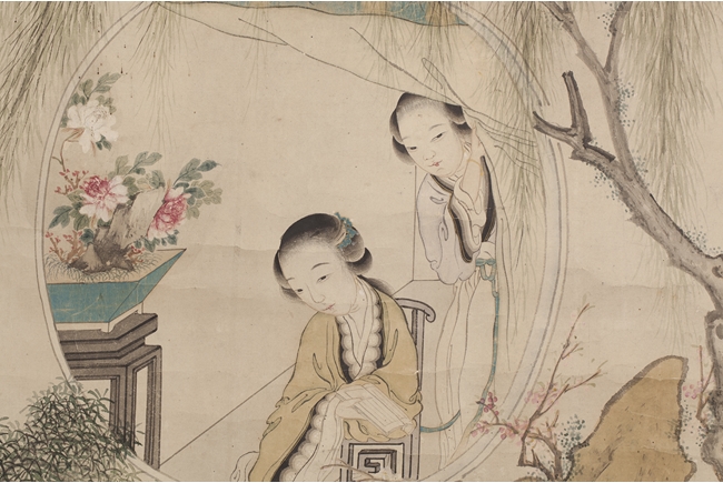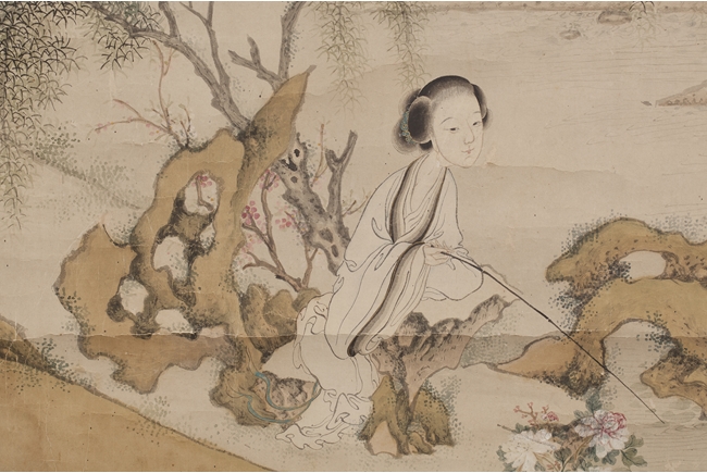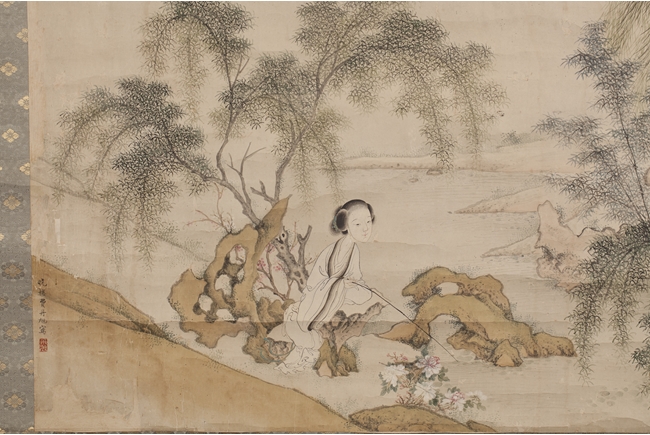 This beautiful painting depicts three elegant maidens, one is fishing while the other two watches from a house. Artist mark and seal on the left corner.