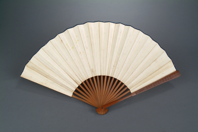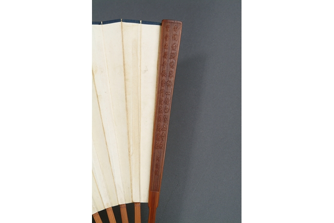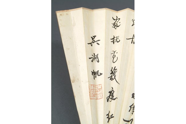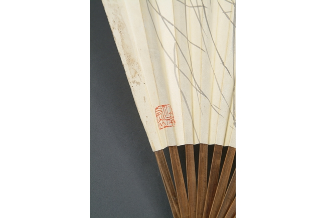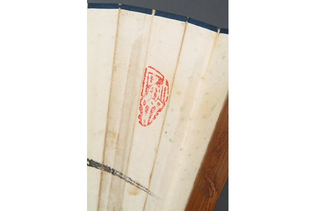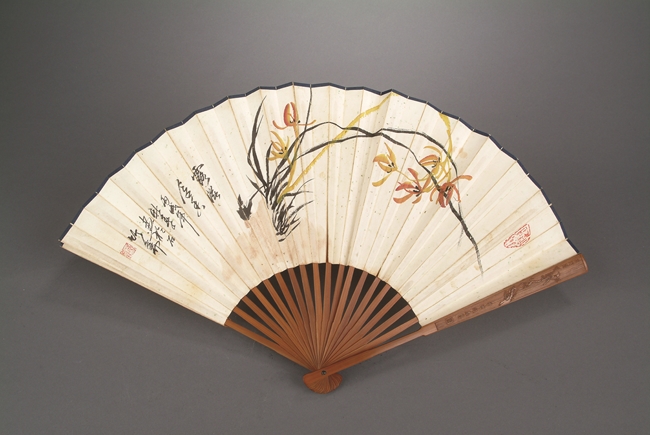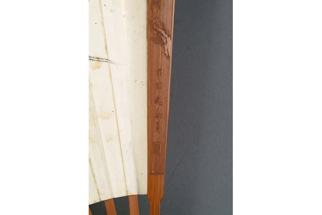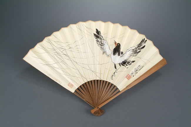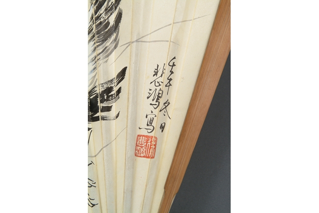 A pair of well made Chinese fans each depicting a different theme, the first one features a blossoming flower across the front side, a set of calligraphy and artist seal 'Zhu Qi' on the side. The second one features a lone bird amidst elegant looking lines that are similar to bamboo leaves, artist seal 'Xu Bei Hong' on the side. Set of calligraphy on the reverse.