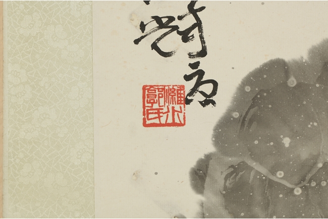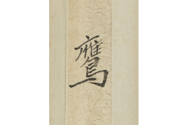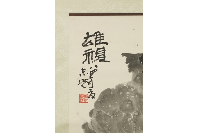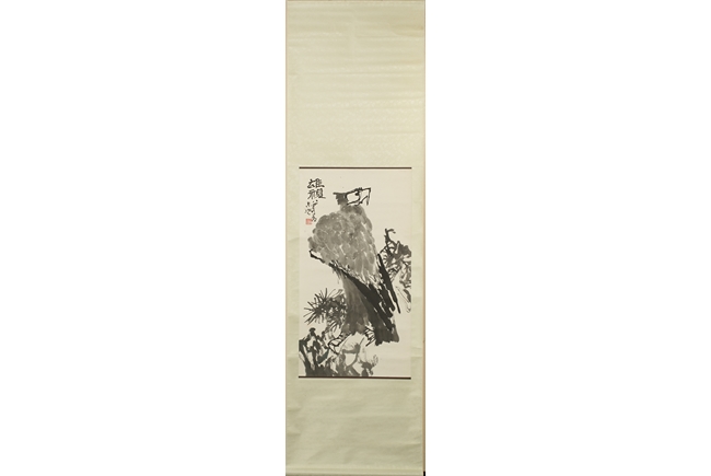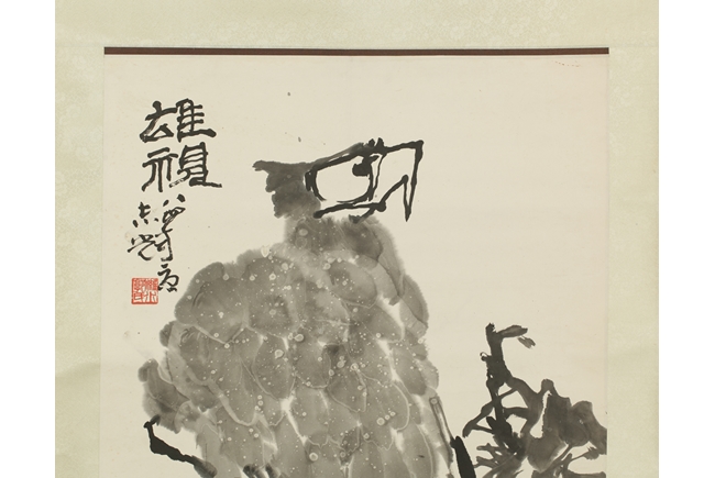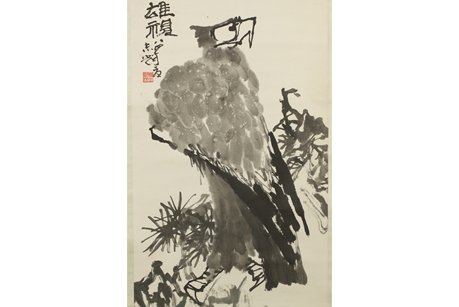 Ink on paper painting that depicts a ferocious bald eagle perching on top of a pine tree branch with carefully drawn details of the eagles feather, artist seal mark on the side.