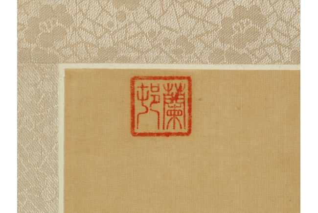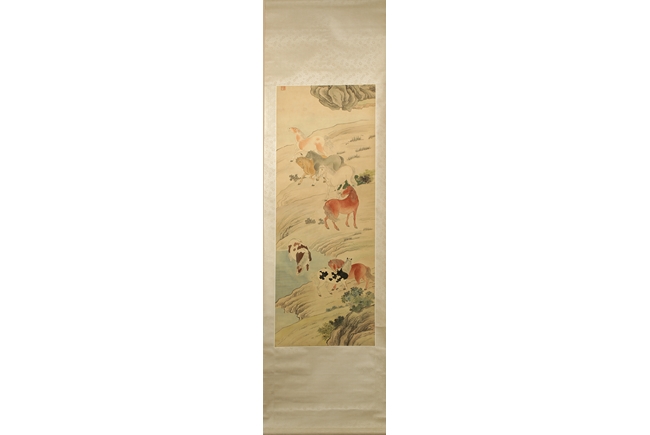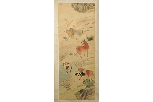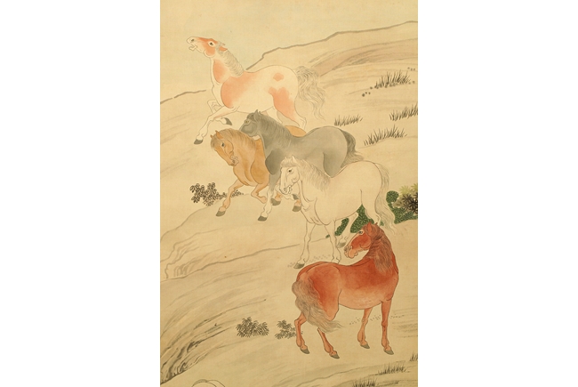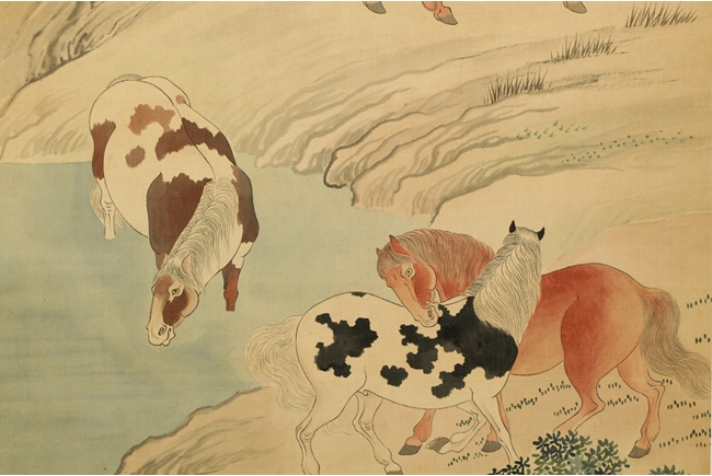 Beautifully drawn painting on silk of eight different horses near a lakeshore, each with different actions. Artist mark on upper left corner.
