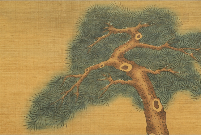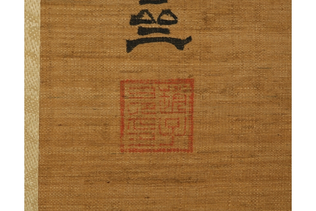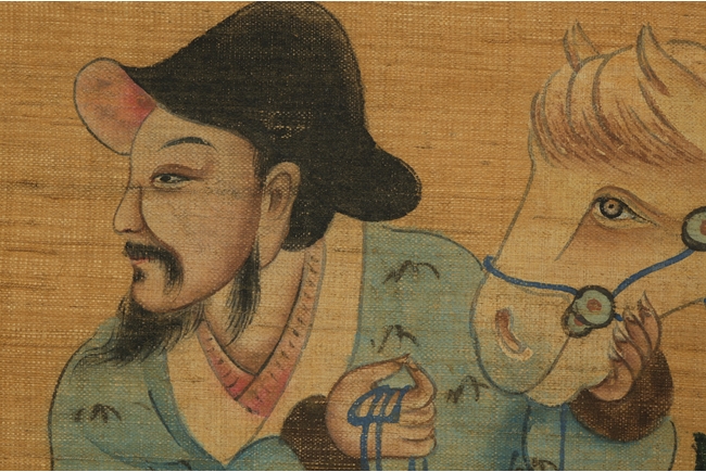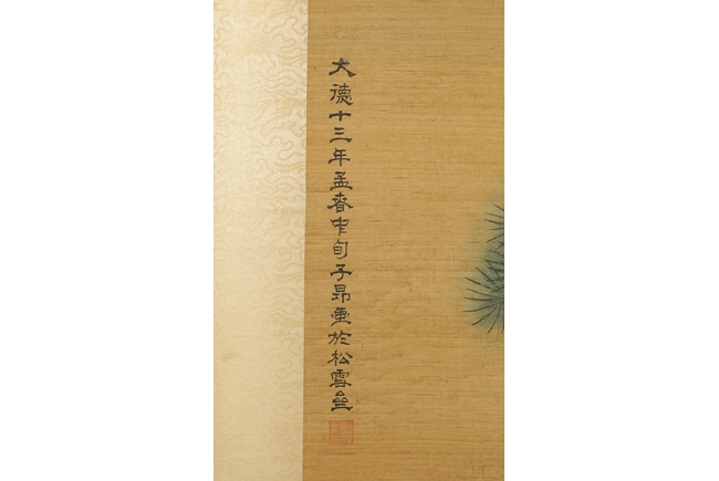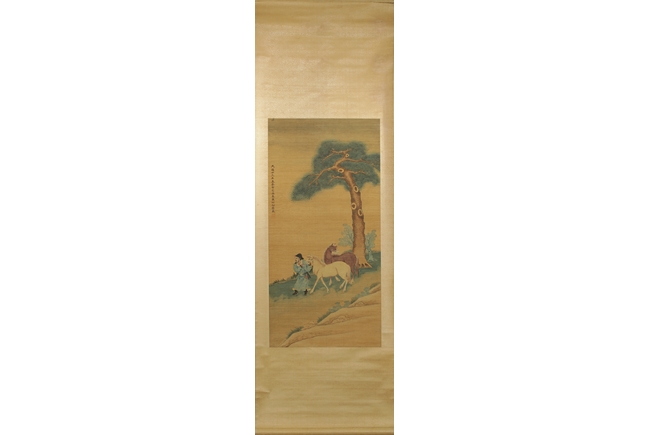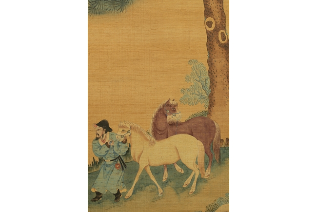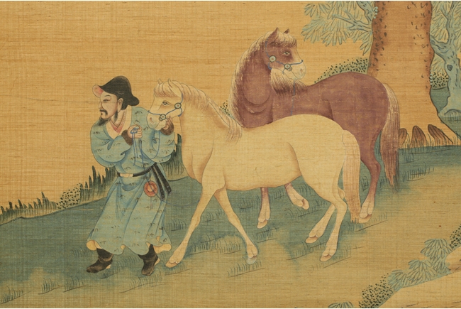 The painting on silk depicts a man leading two horses past a large pine tree in the wilderness. Colophon, artist mark and seal "Zhao Ziang".