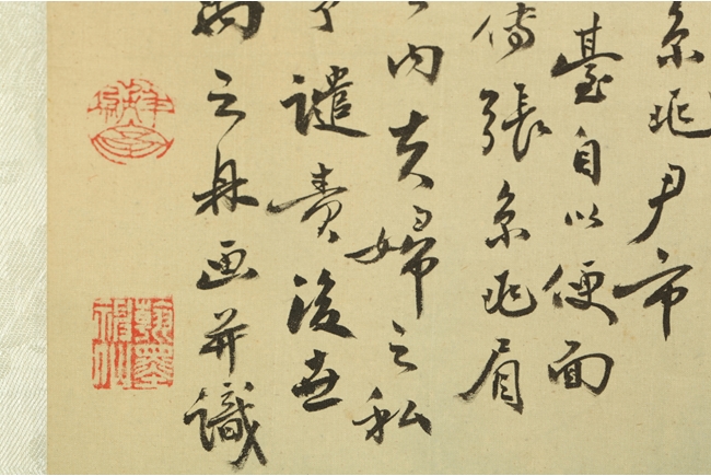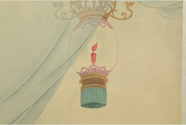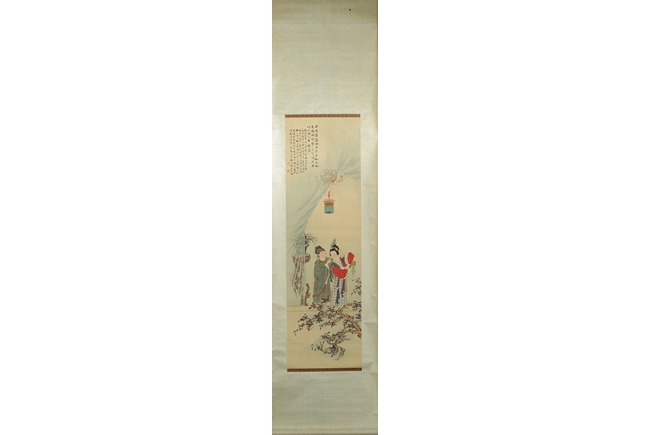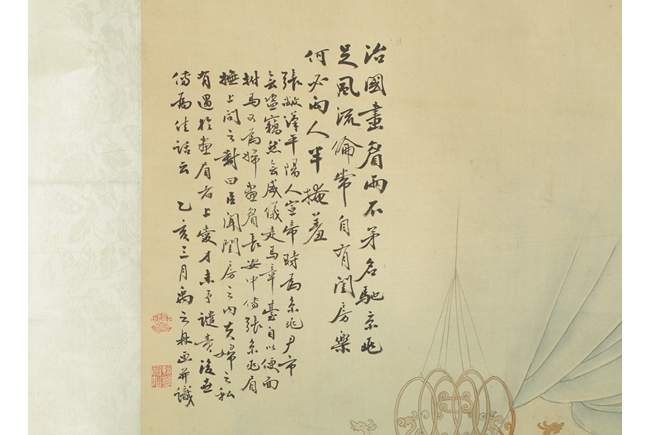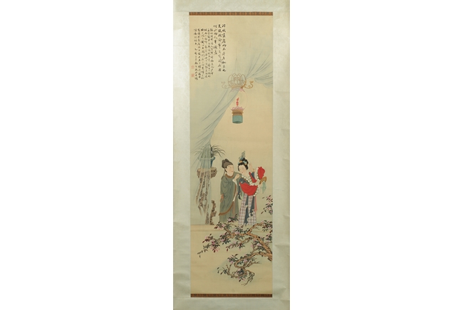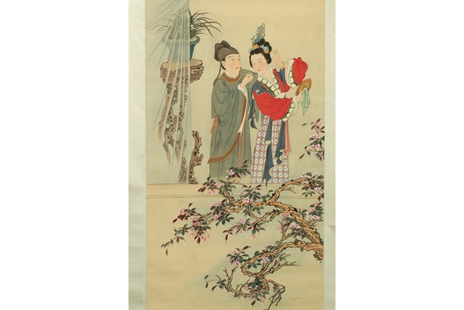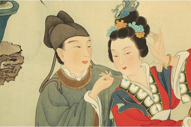 The painting depicts a pair couple in their room, the man applying eyebrow make up for the woman in a romantic setting. Poem, calligraphy, artist mark and seal on the top left corner.