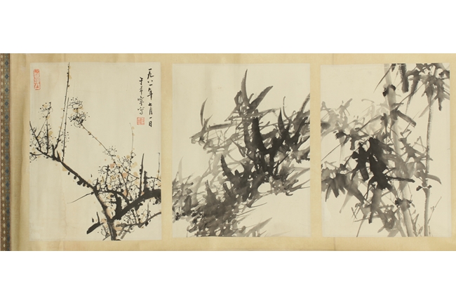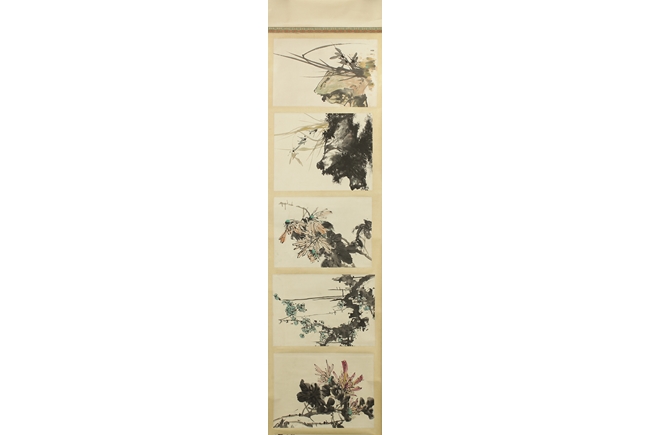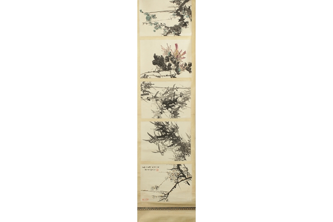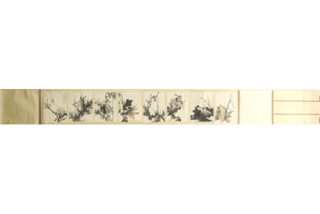 The scroll includes eight separate paintings, each depicting a different flower or plant blossoming in its natural habitat. Artist mark and seal "Yu Xining".