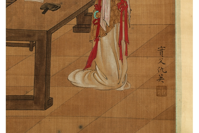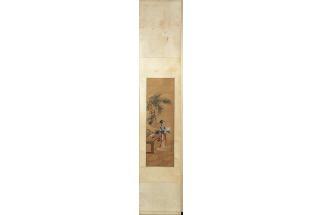 This painting depicts a beautiful lady dressed in an elaborate outfit standing near a table with a piece of letter in hand, all behind a framed circular window with glimpse of tree branches and rocks. Artist seal and mark "Chou Ying" on the side.