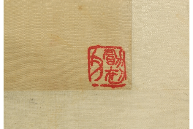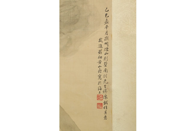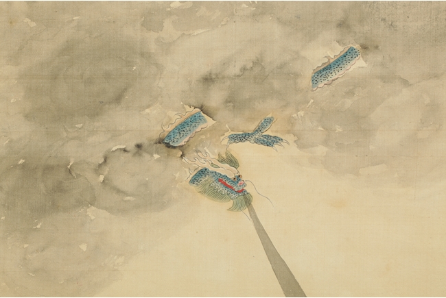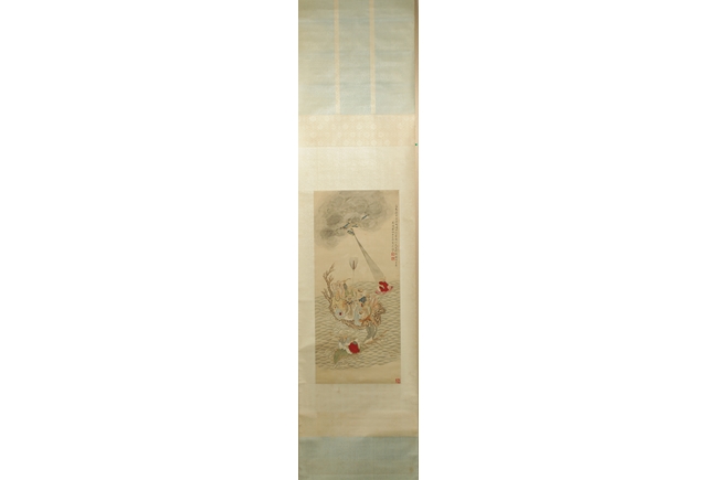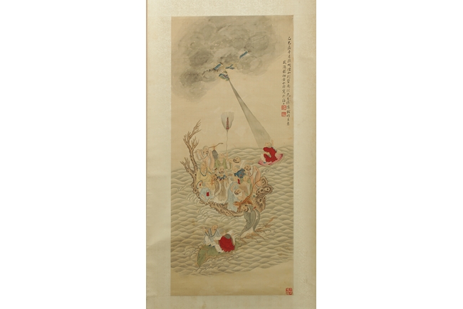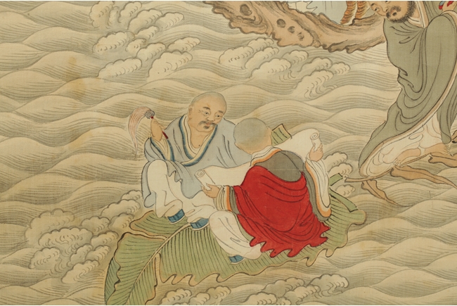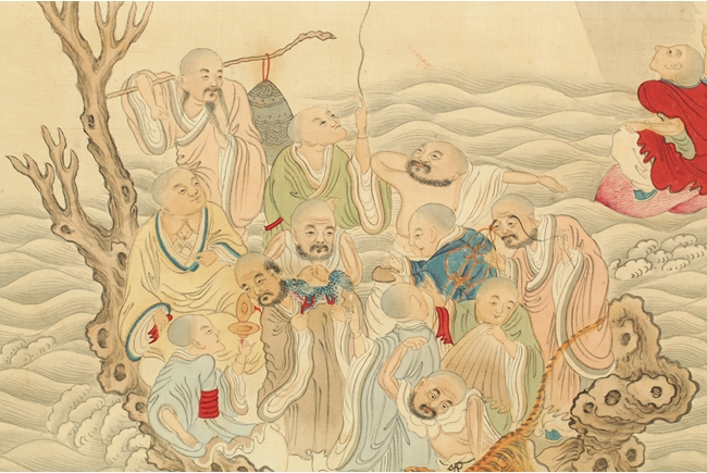 The painting depicts sixteen Arhats traveling on wooden raft across the ocean. All of them carrying different religious instruments, and most of them are conversing amongst themselves. A baby tiger is on the raft as well, and a dragon looming in and out of the clouds in the sky. Artist "Huang Shanshou" seal and mark on the right.