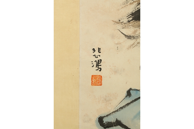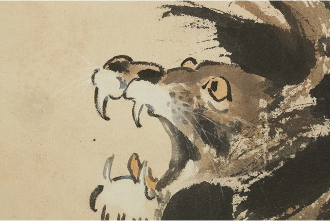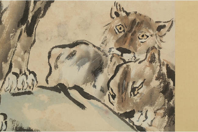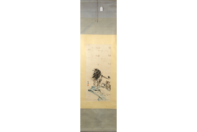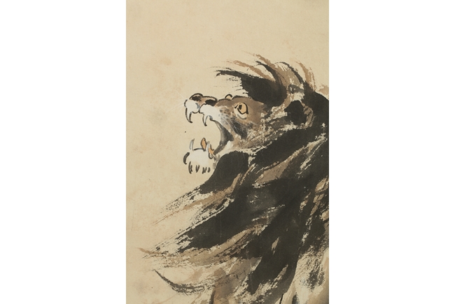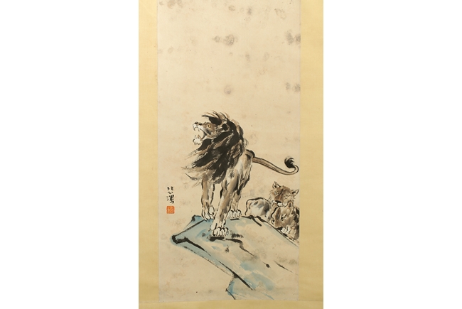 The painting depicts a ferocious male lion walking on ledge, jaws wide open in defense of the lioness and cub. Artist seal and mark "Beihong" on the left side.