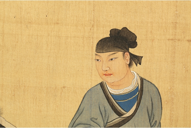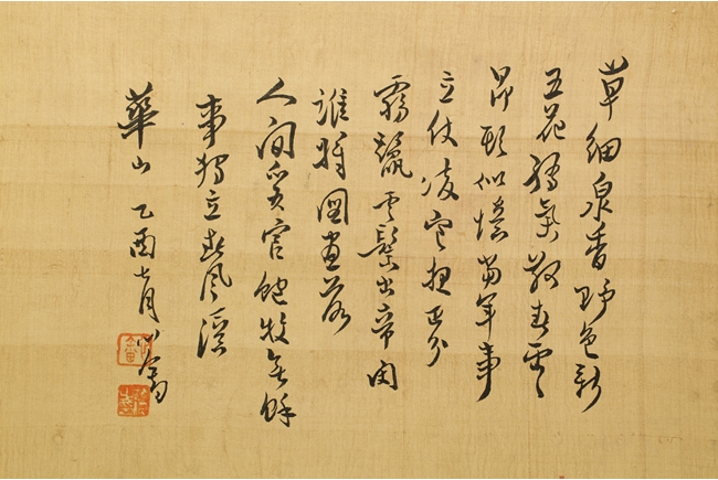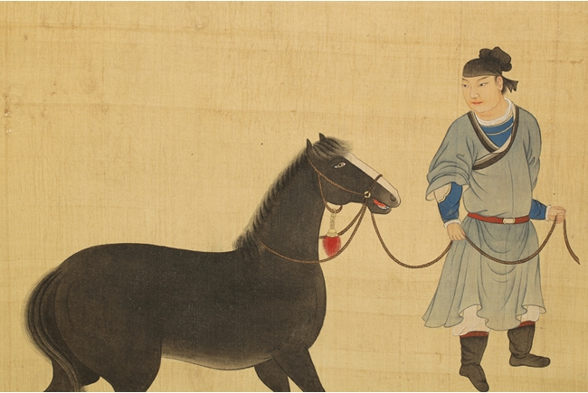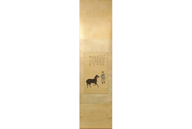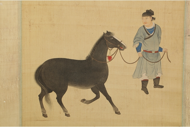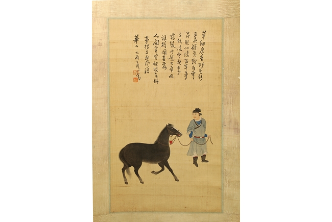 The painting on silk shows a man holding the horse by rein, leading it forward. Poem, calligraphy, artist seal and mark "Pu Xinyu" on the top.