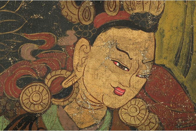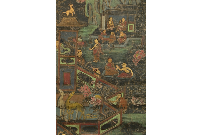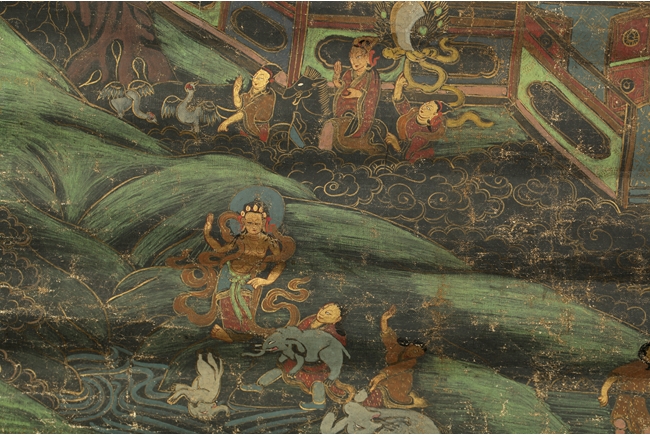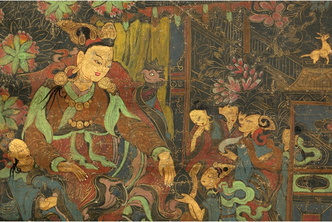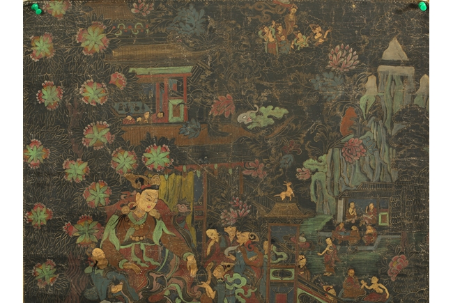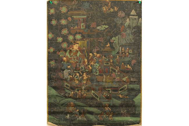 Painted and gilt on cloth depicting a scene with many people gathered around a central Bodhisattva in a palace setting. Qing Dynasty period.